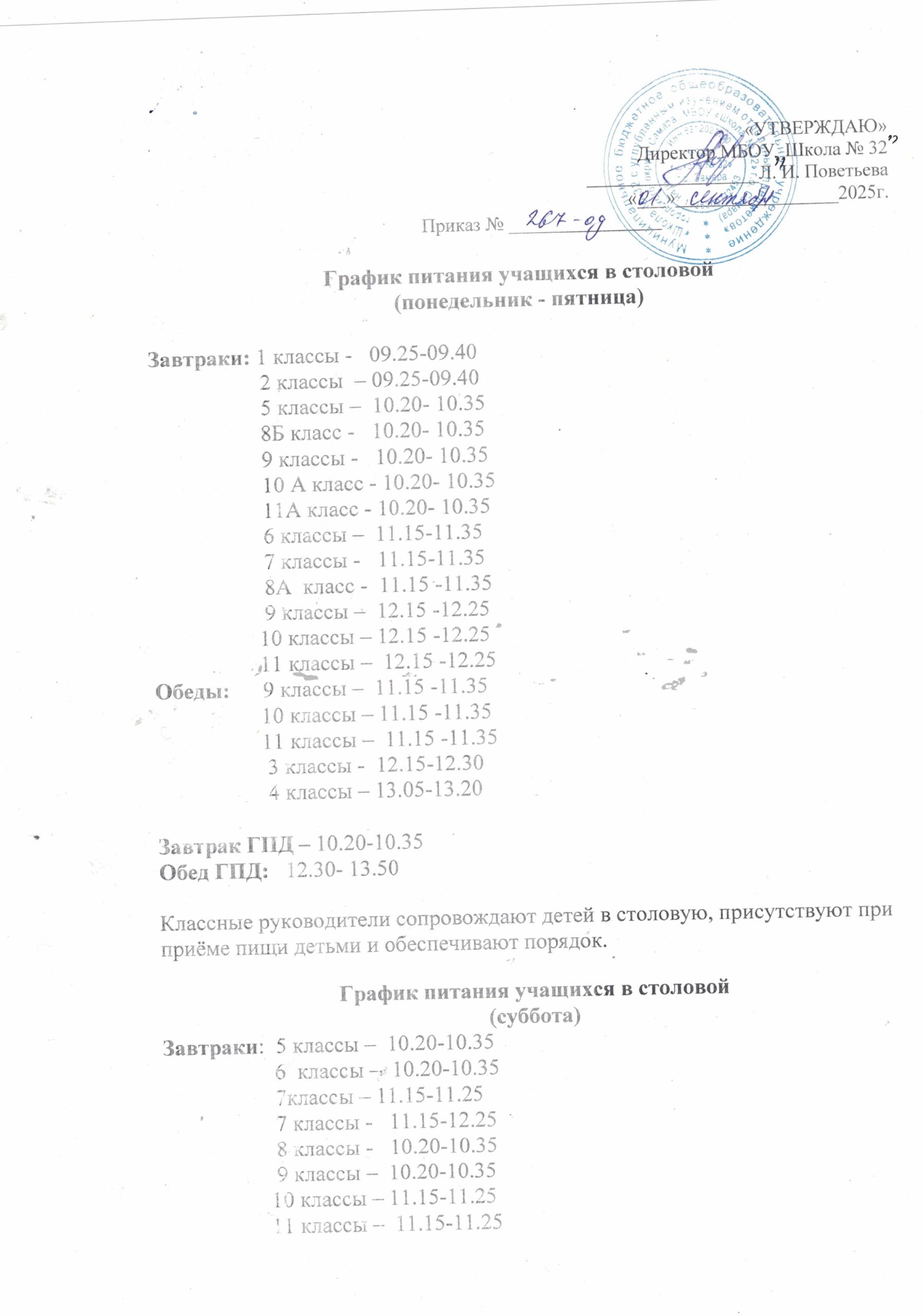 График питания учащихся в столовой