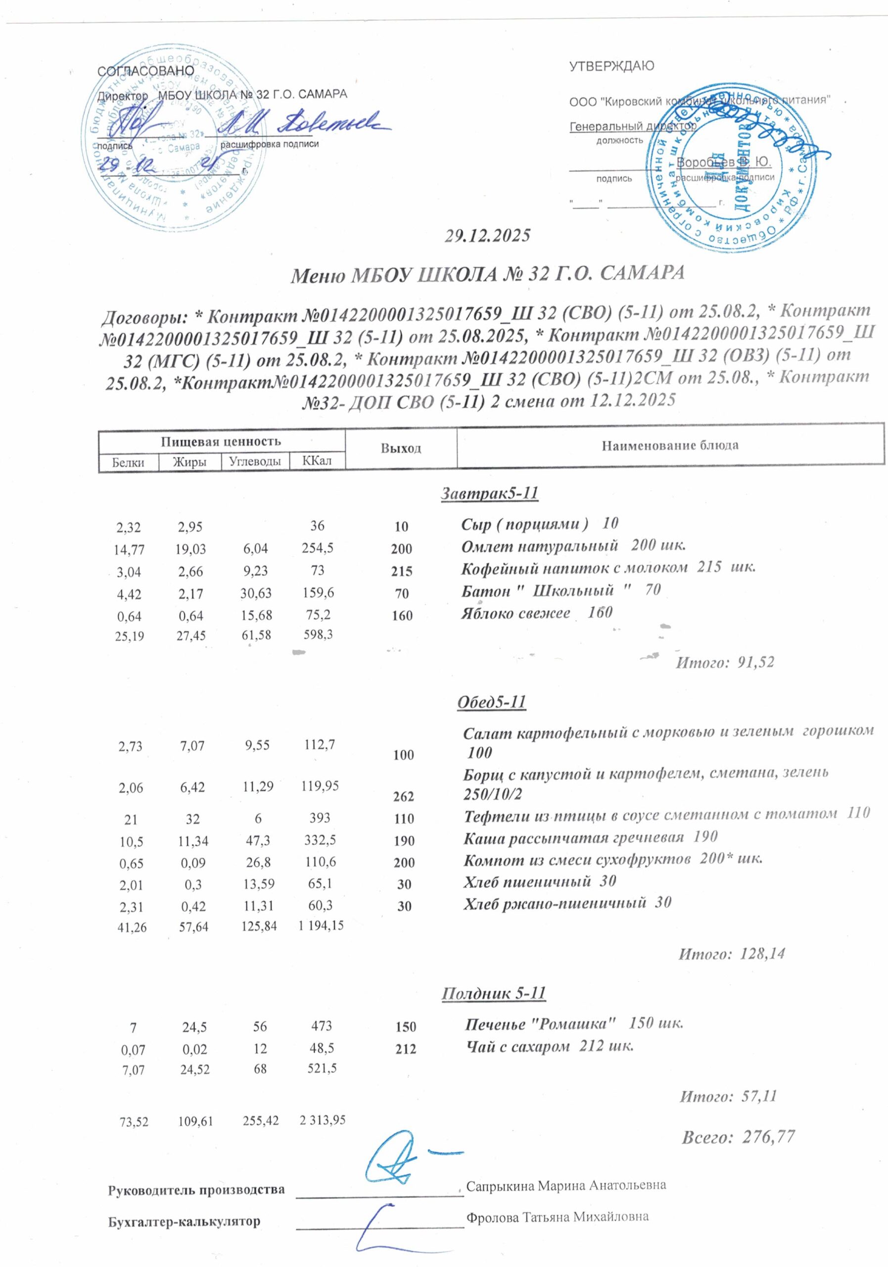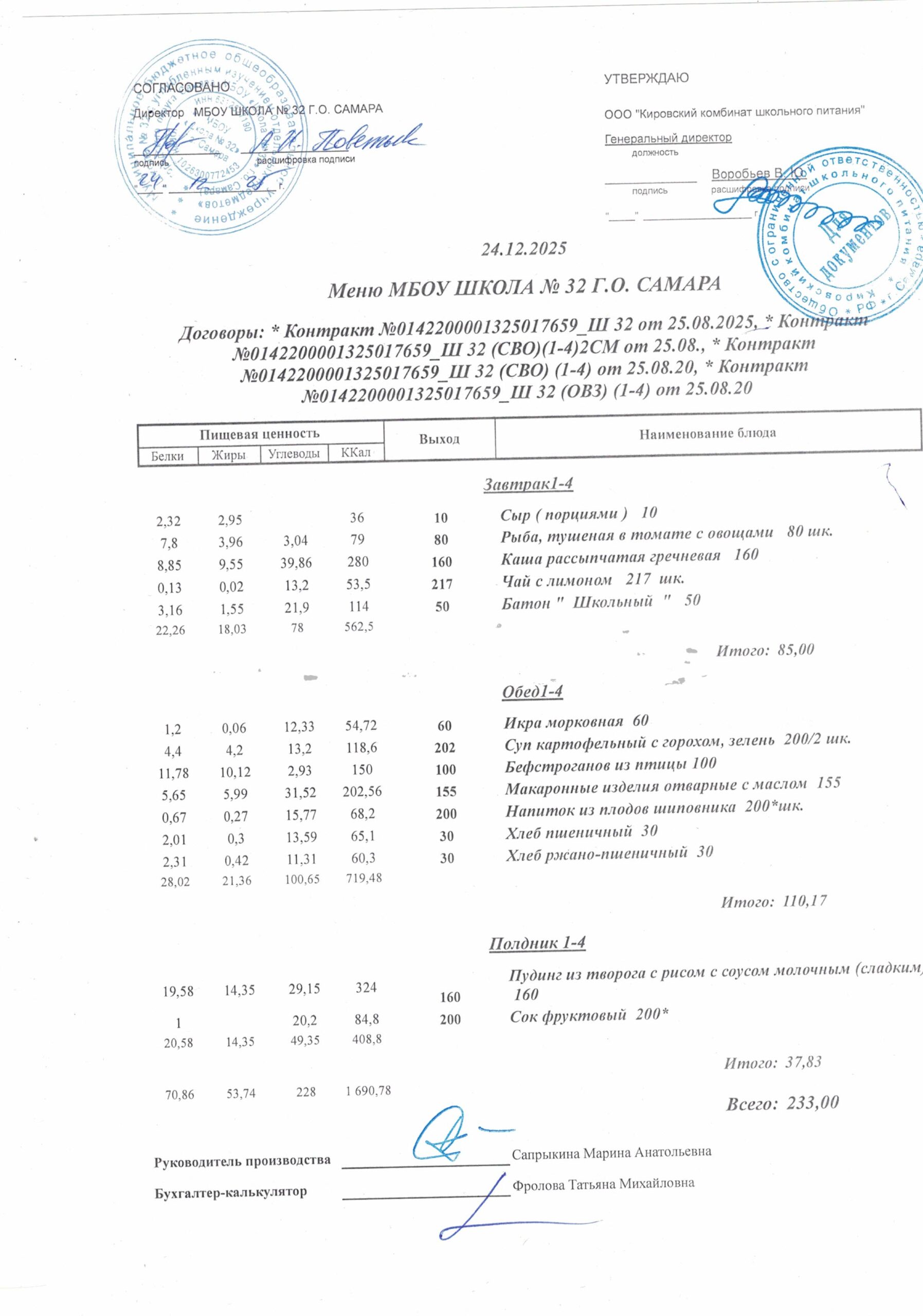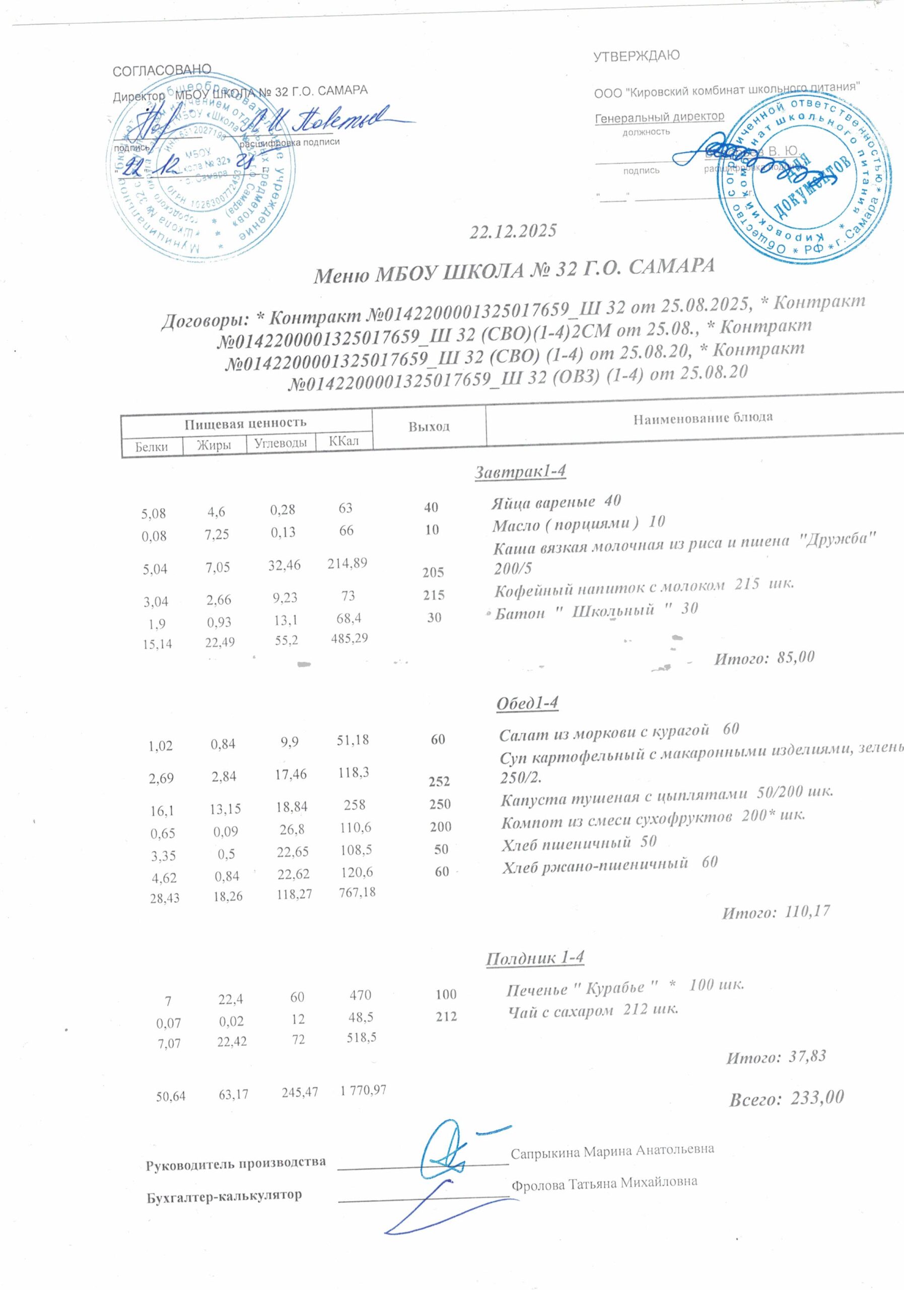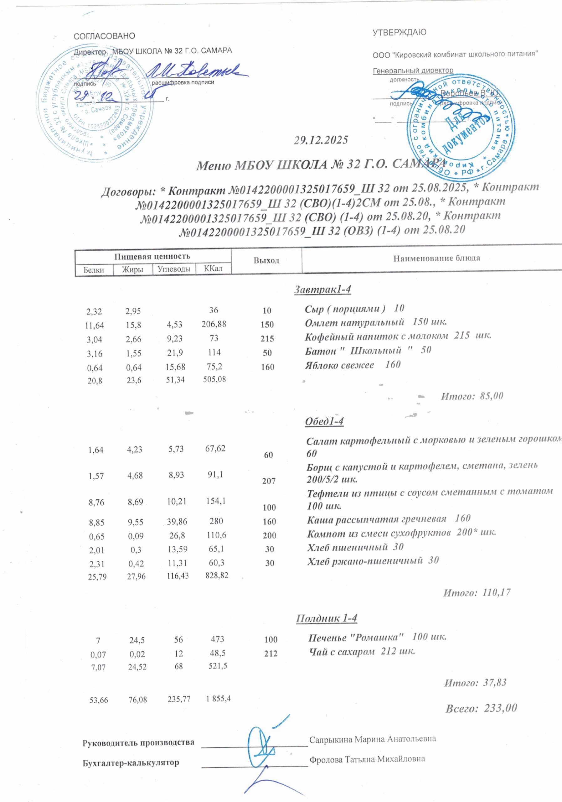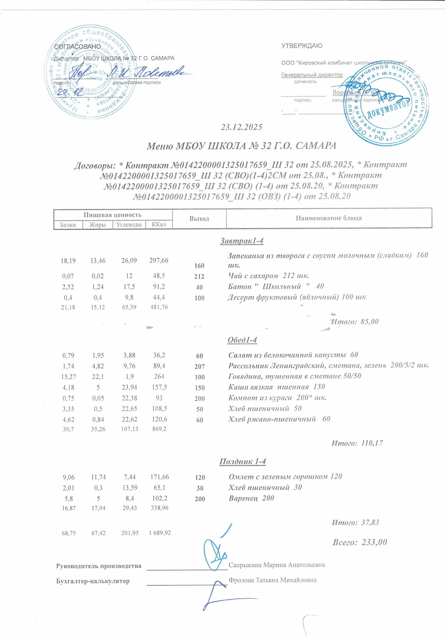 Утвержденные, сканированные копии ежедневного меню