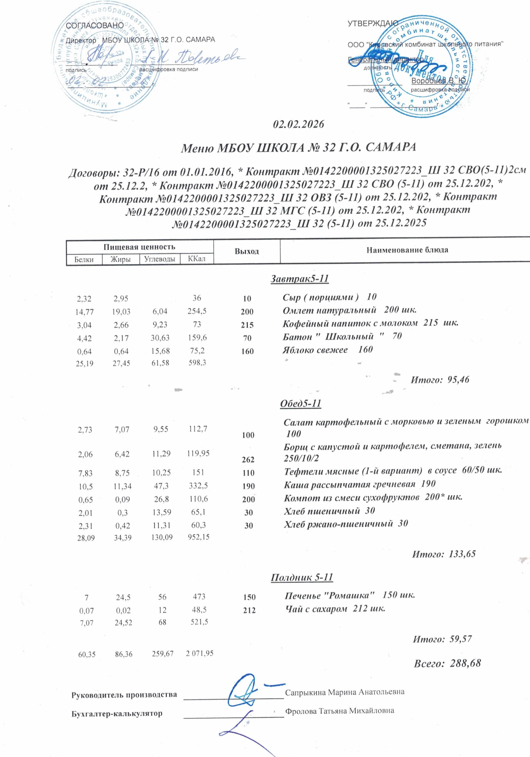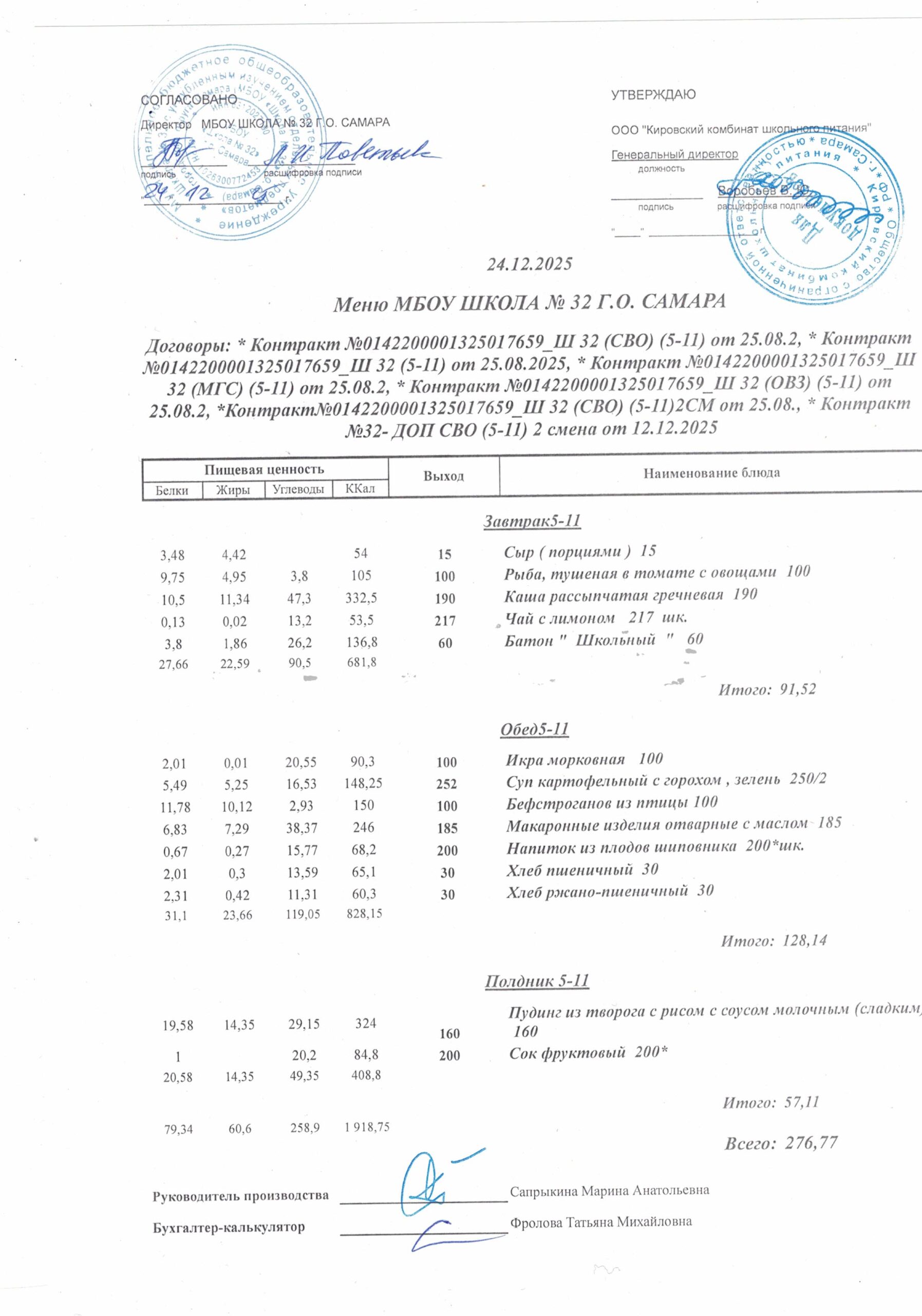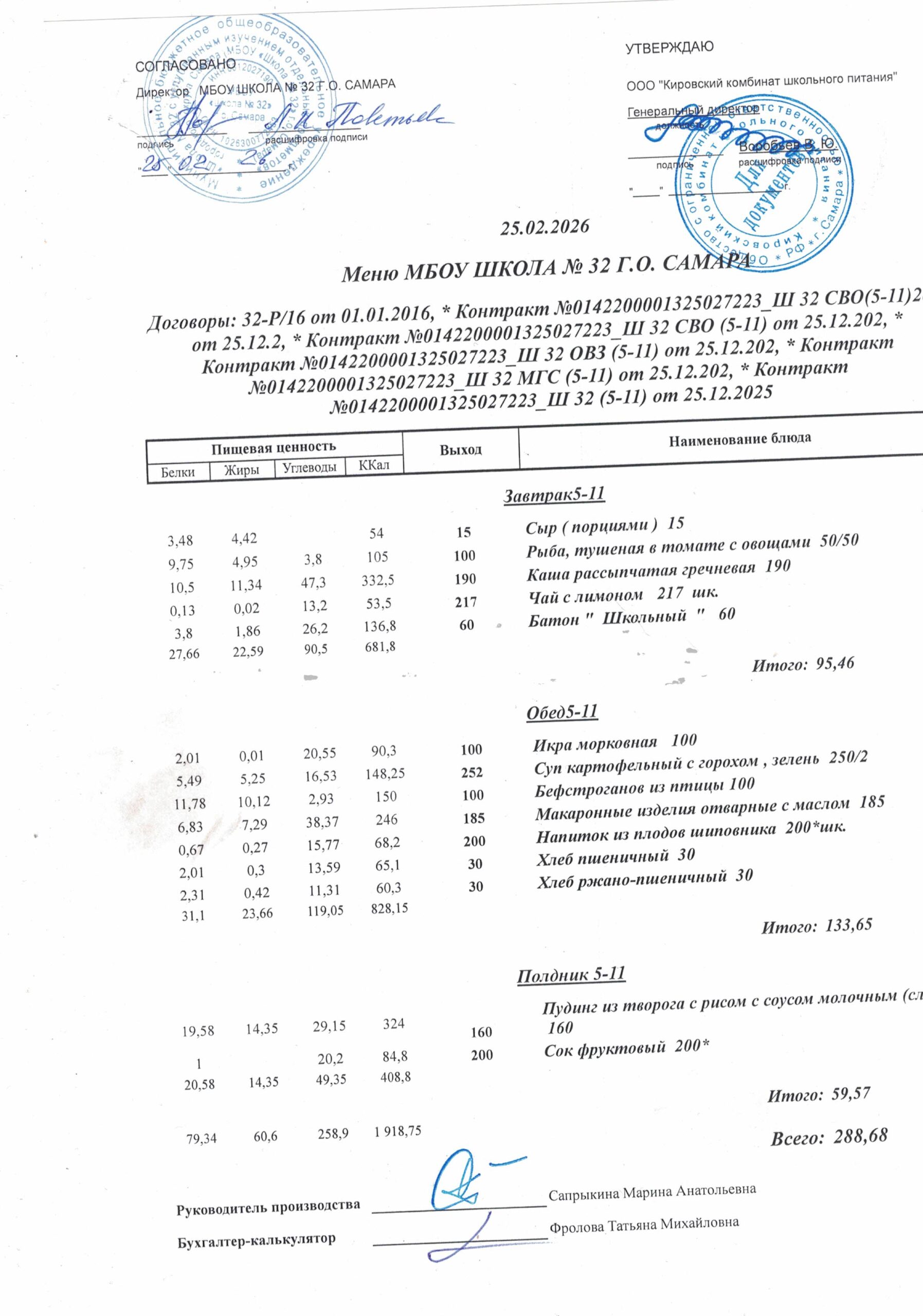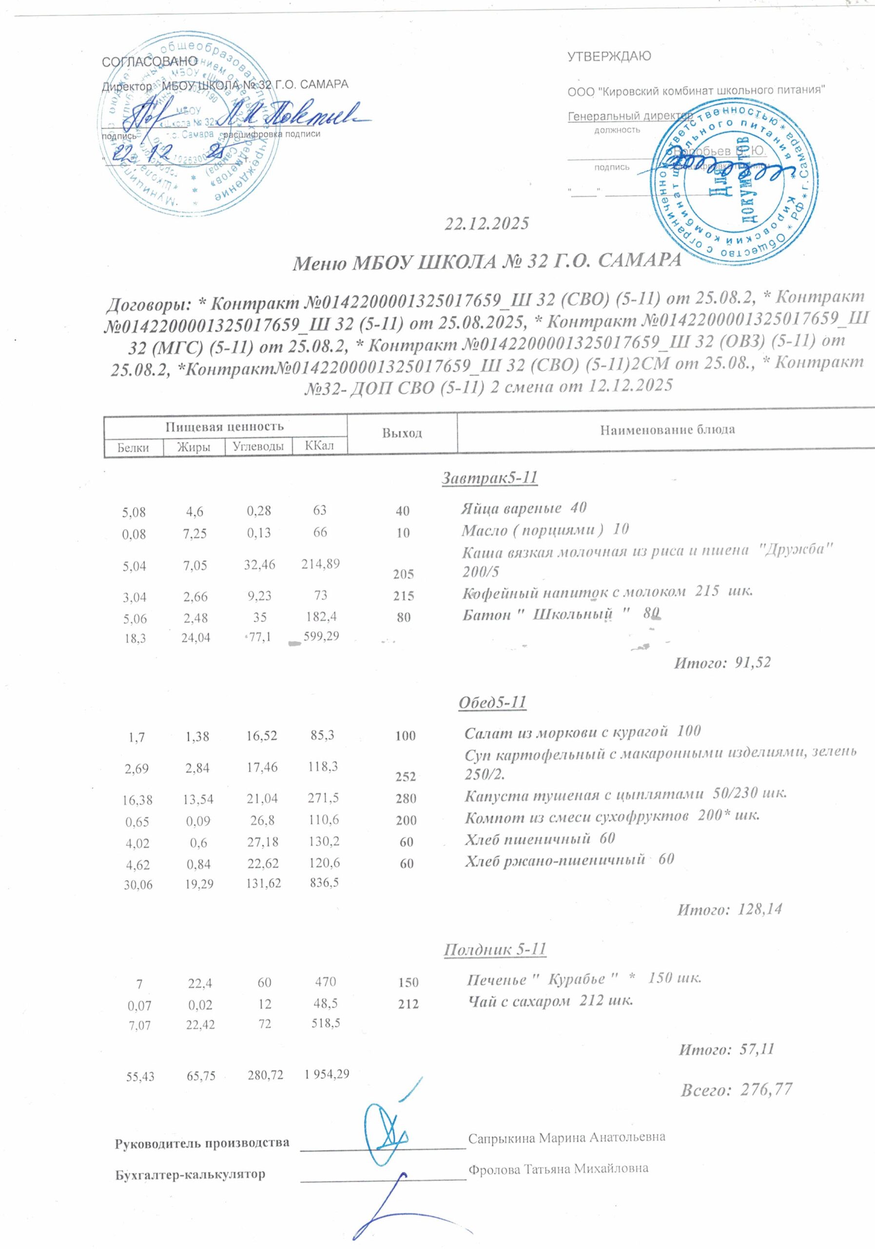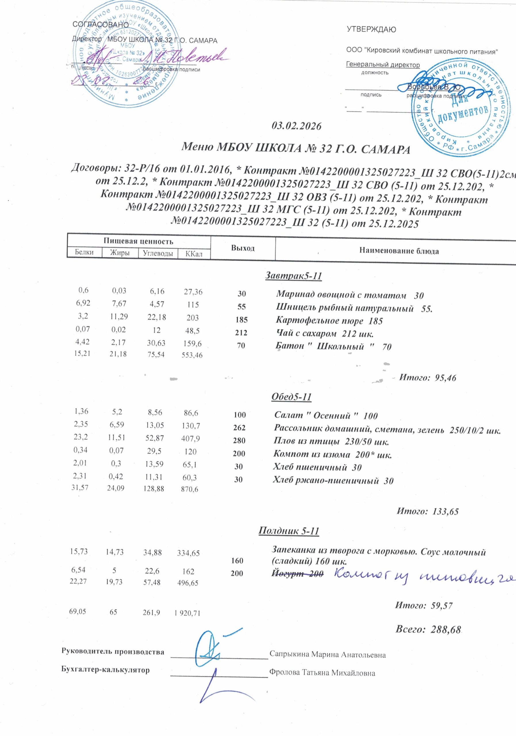 Утвержденные, сканированные копии ежедневного меню