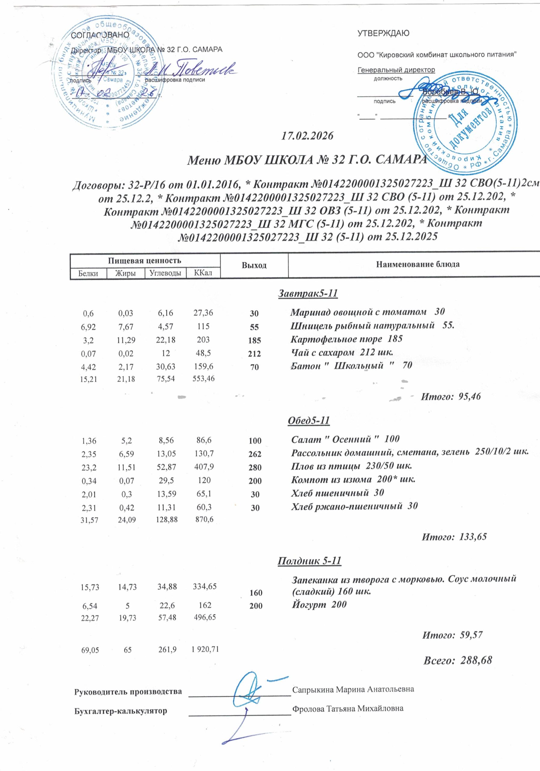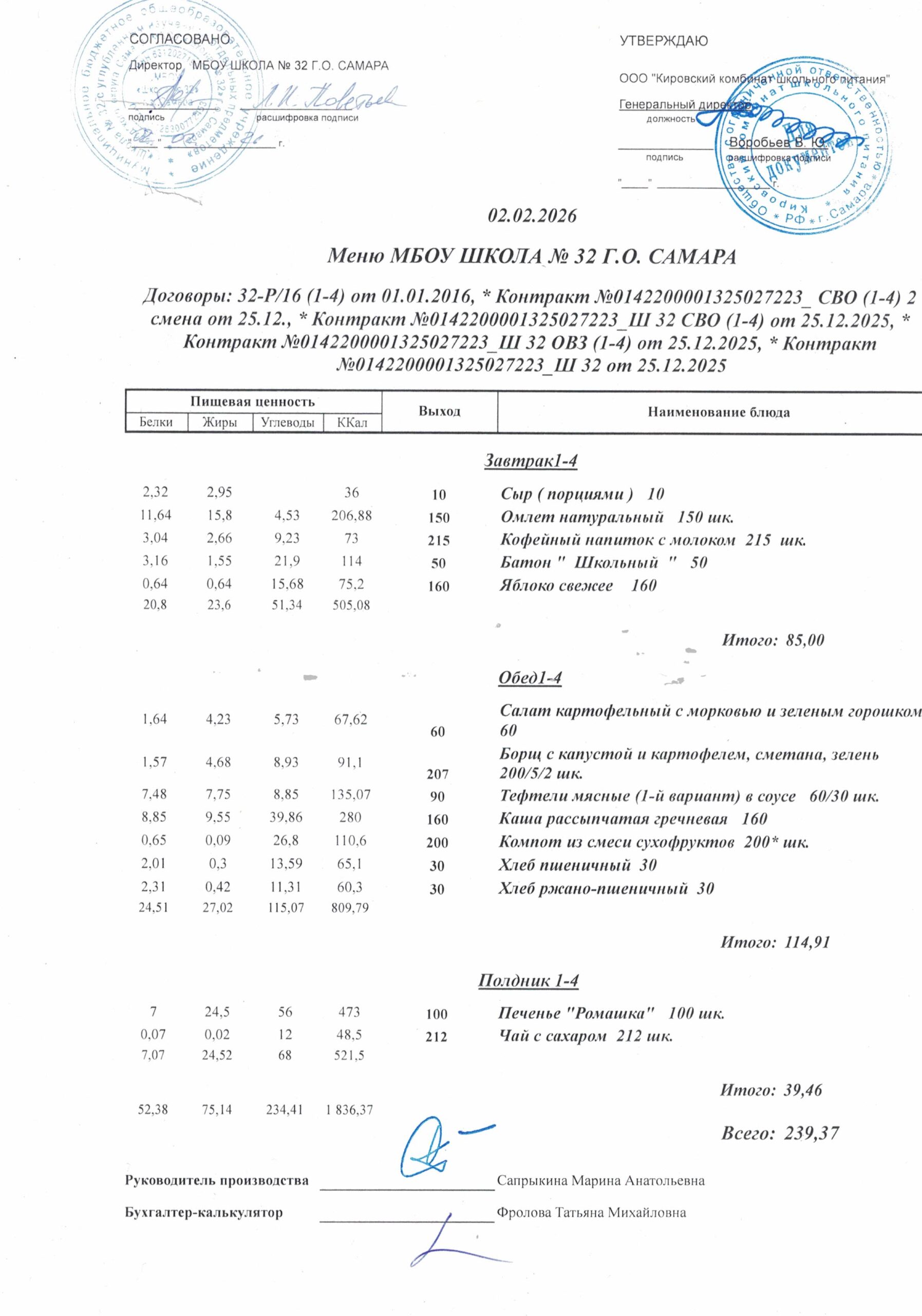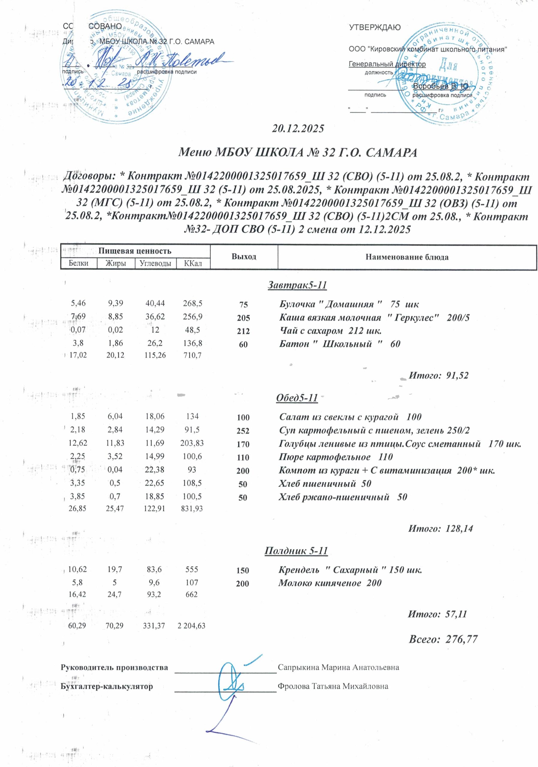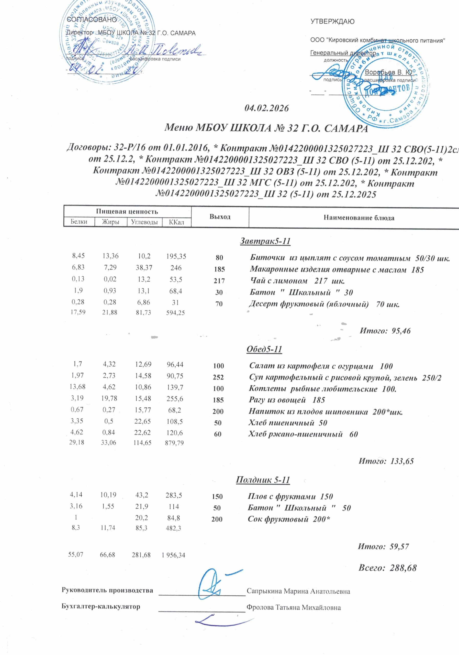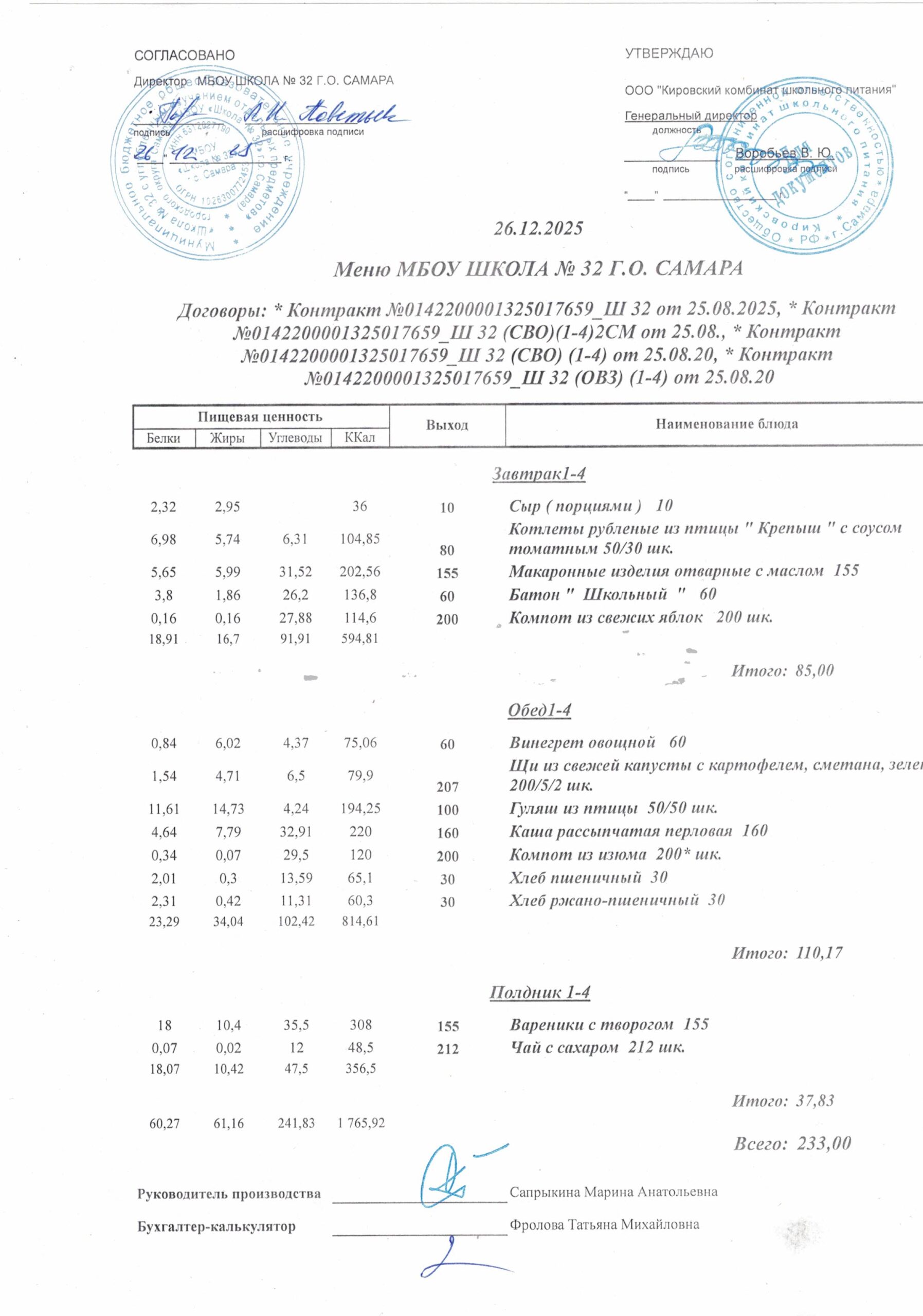 Утвержденные, сканированные копии ежедневного меню