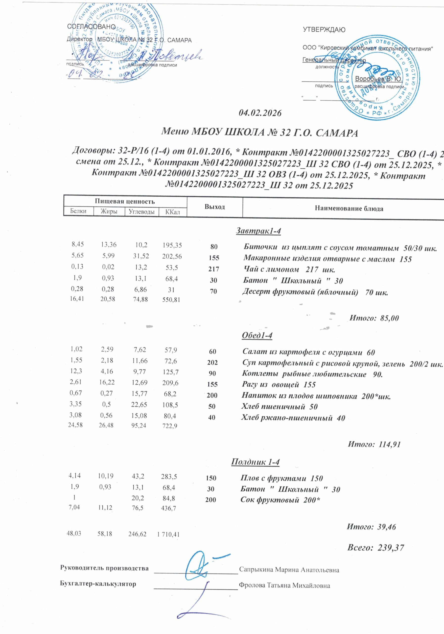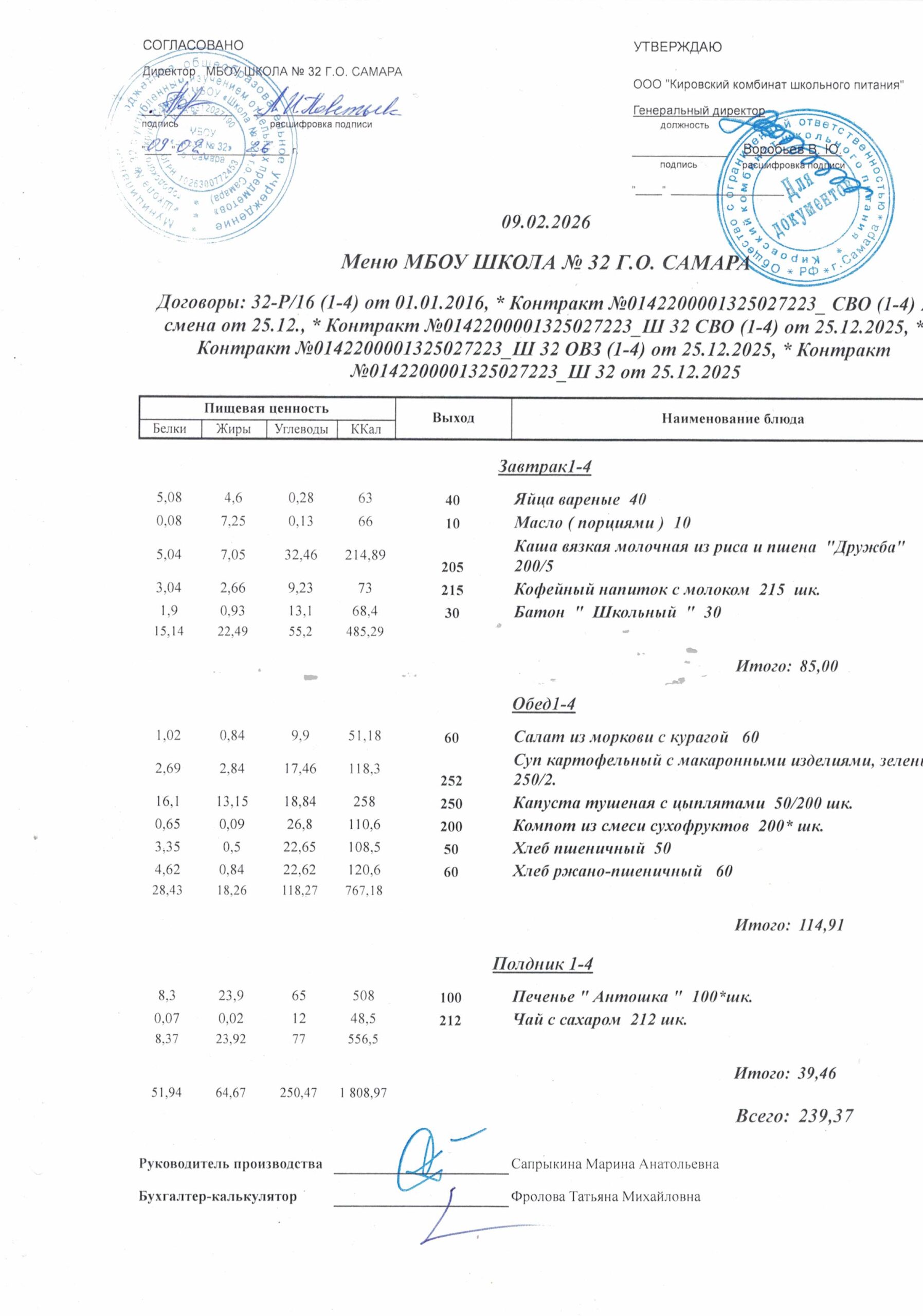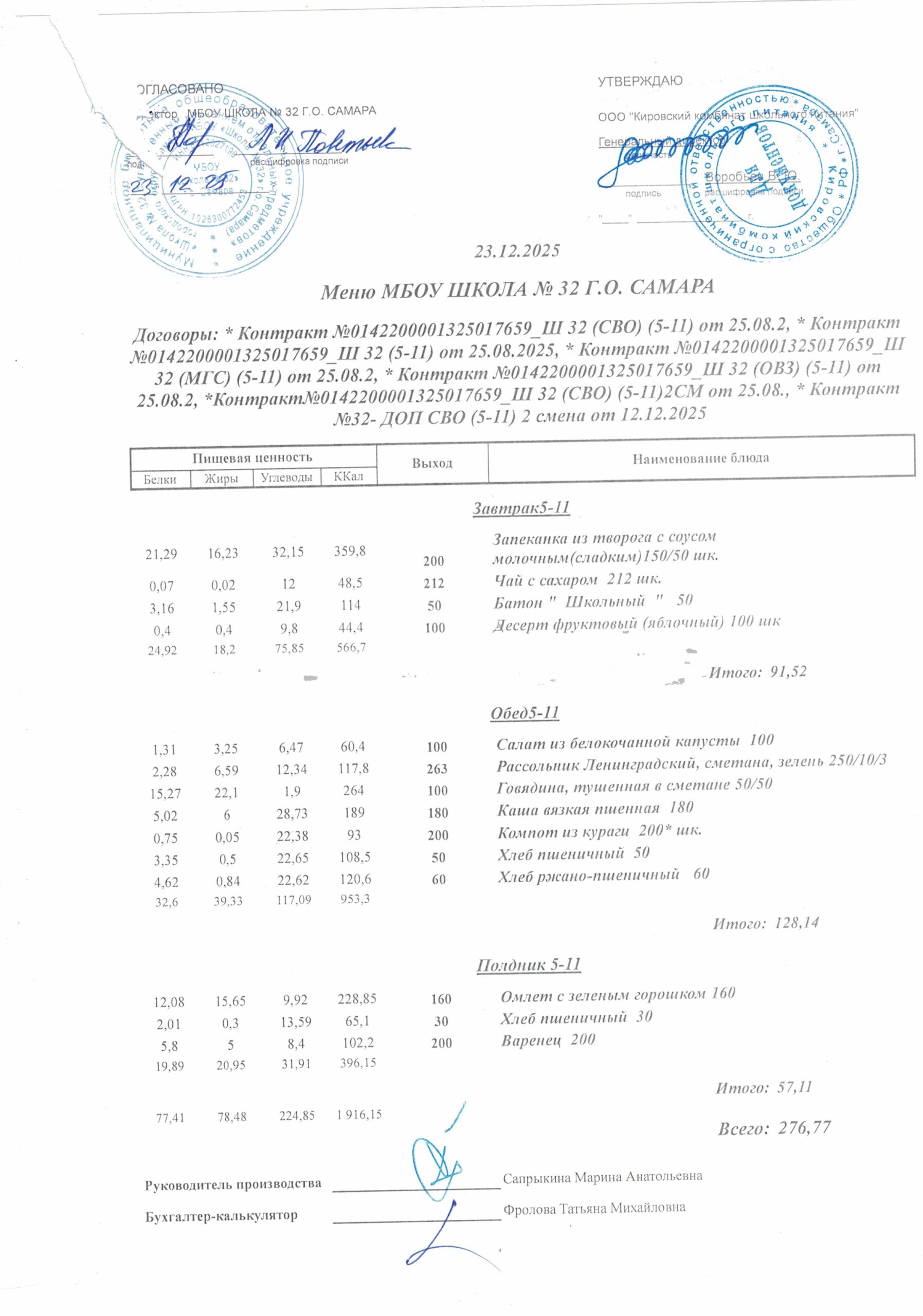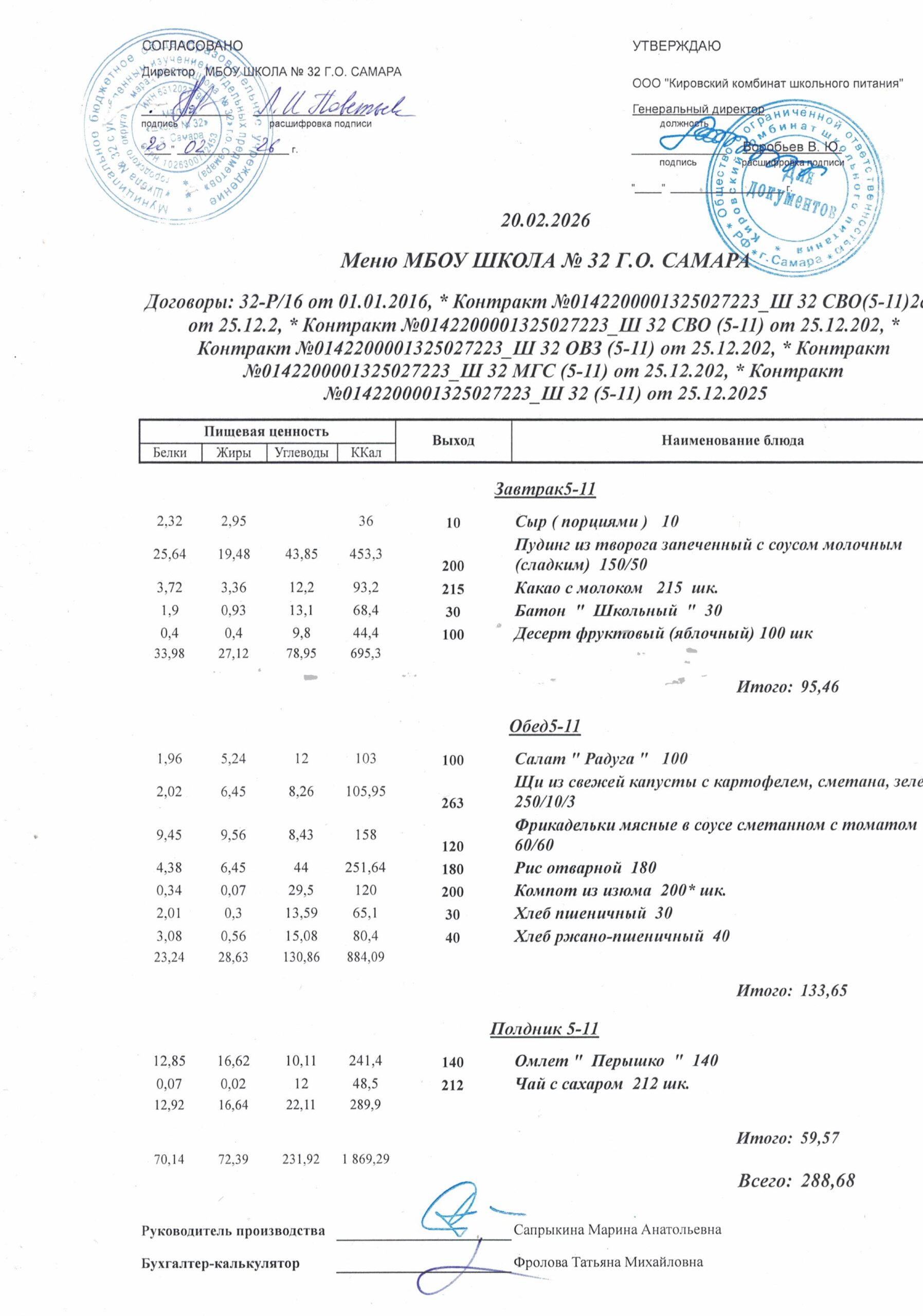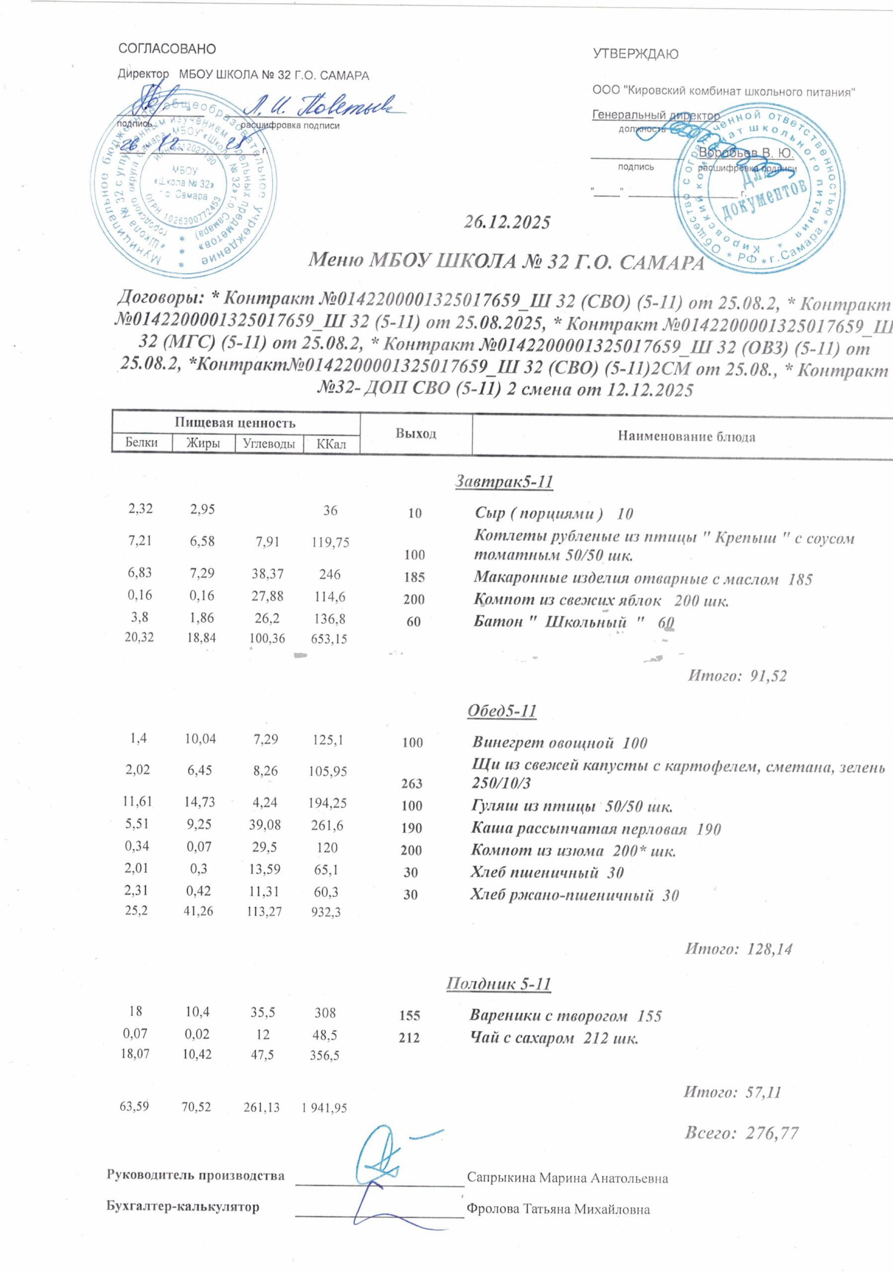Утвержденные, сканированные копии ежедневного меню
