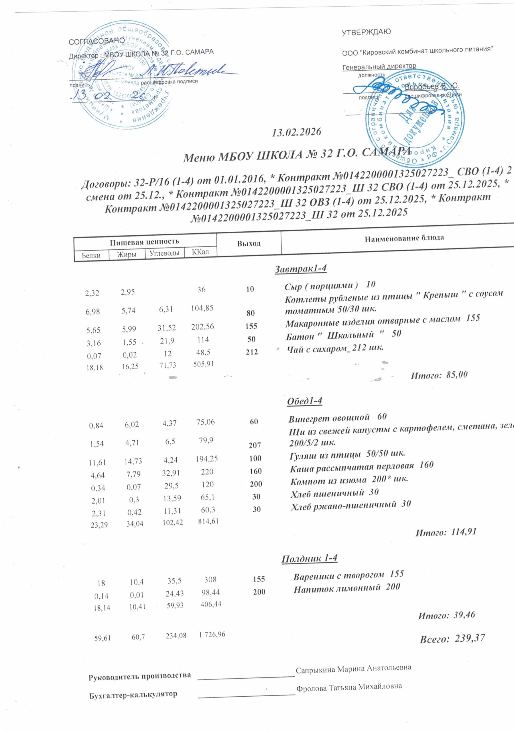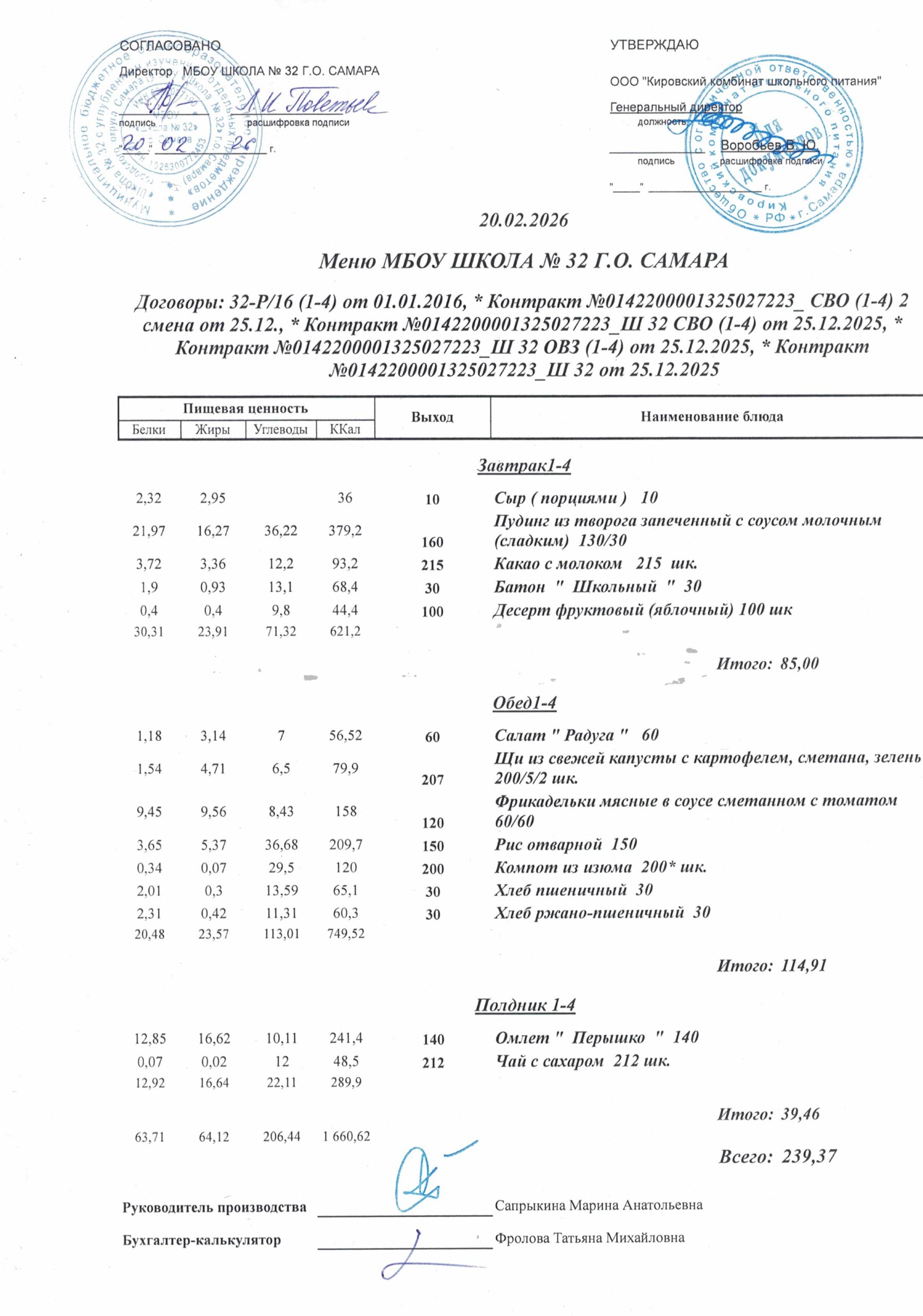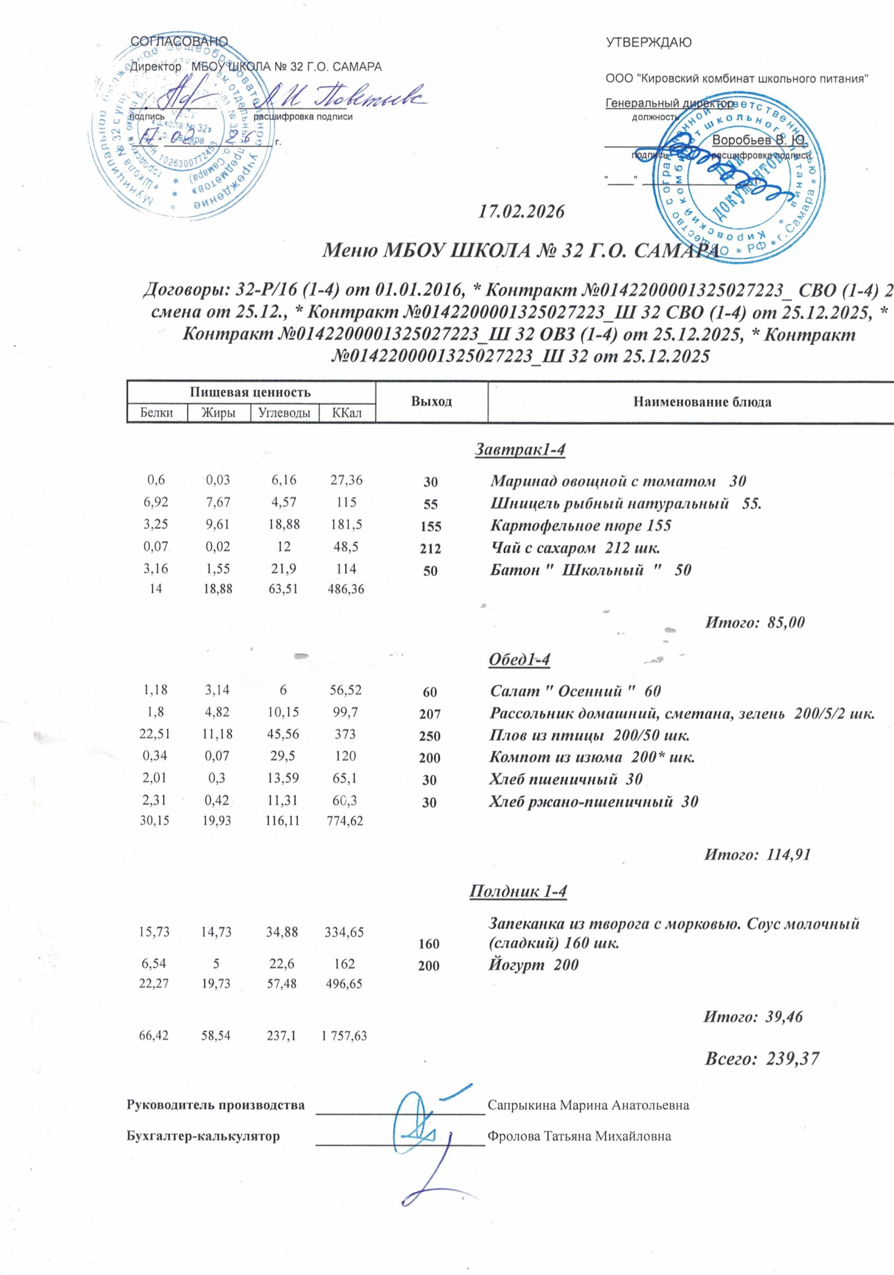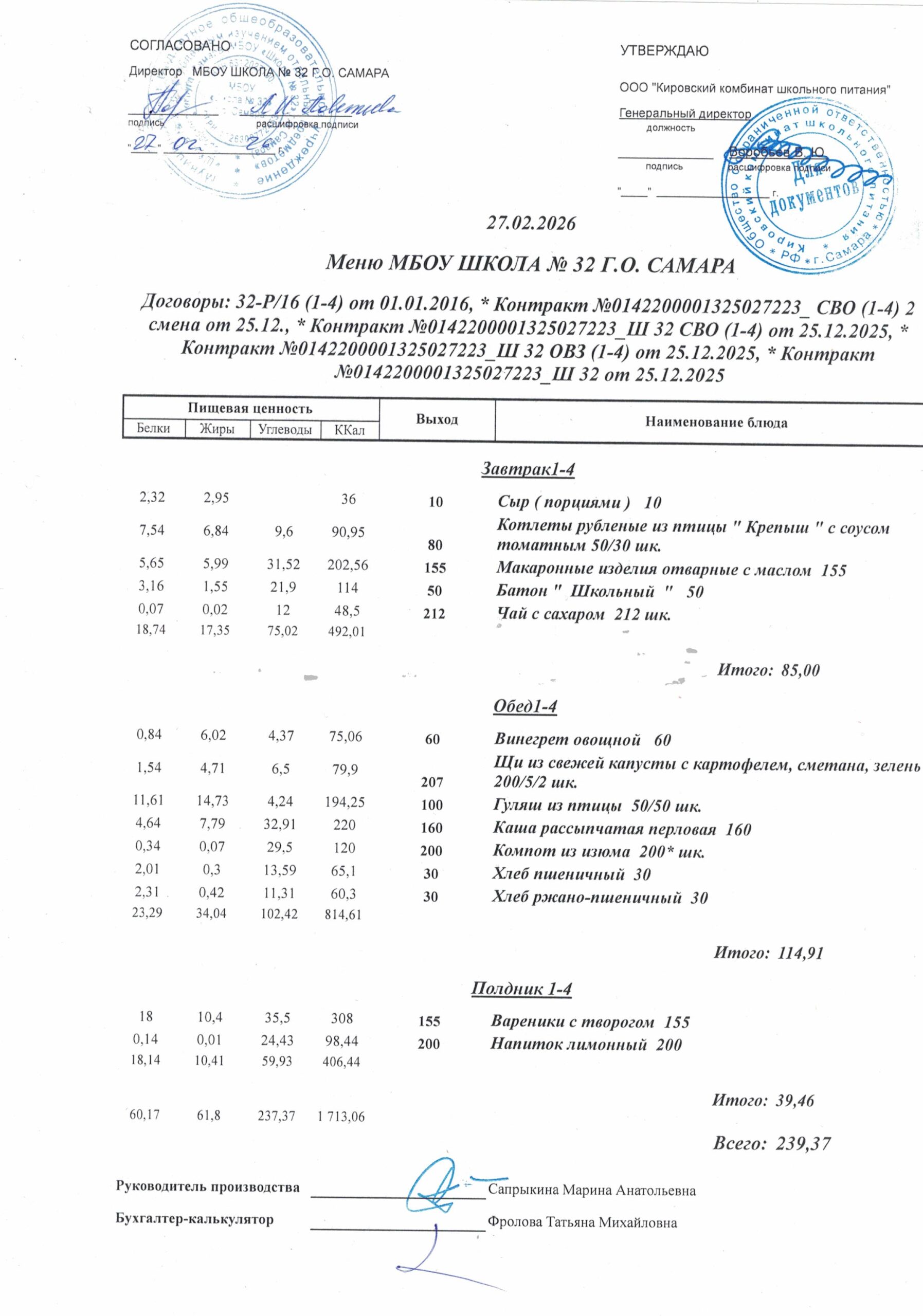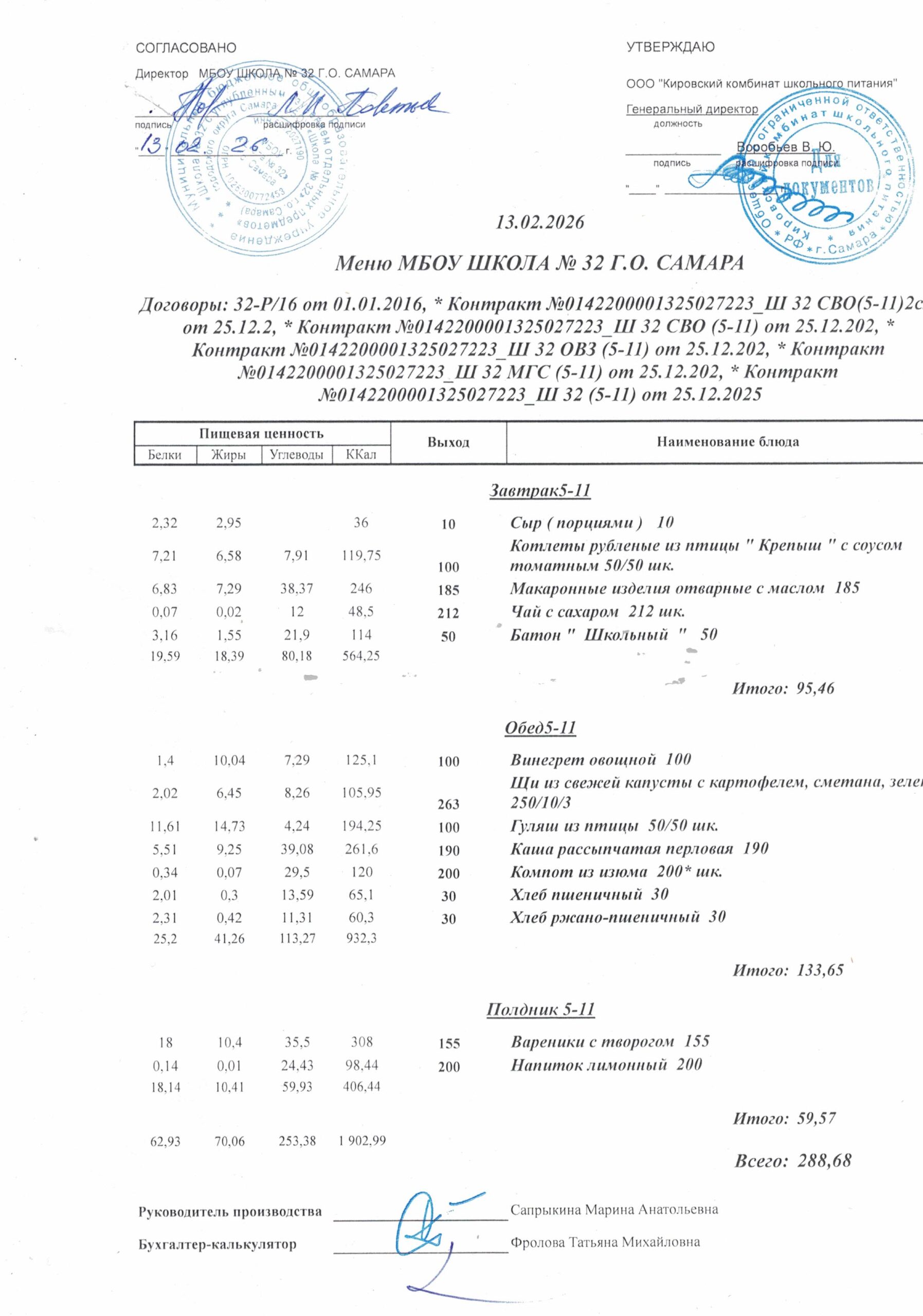 Утвержденные, сканированные копии ежедневного меню